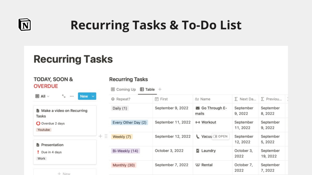 We all have tasks we need to do every day, week, or month. Some of these are big tasks (pay bills) and some are small (pick up lunch). Why not plan out all of these tasks into a single calendar, with reminders that actually work? You can use this template to start managing your recurring tasks and to-do list, without needing to spend a lot of time doing it.